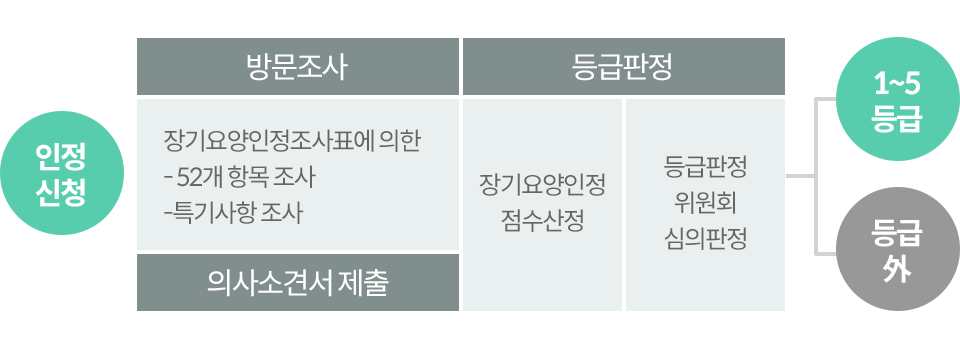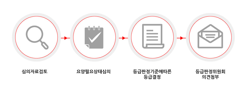 | 심의자료검토 | 요양필요상태 심의 | 등급팡전기준에 의한 등급 결정 | 등급판정기준 의견제시 |